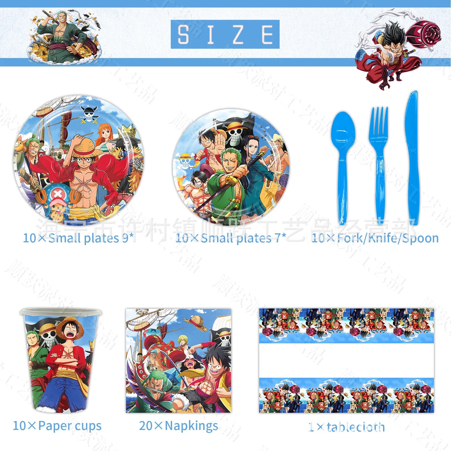 - 🎉 **Diseño único**: Cada plato, taza y cubierto está adornado con tus personajes favoritos de One Piece, aportando un toque de magia a tu fiesta.